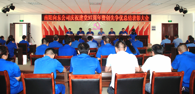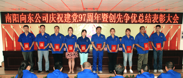 ? ?6月29日,南陽向東公司在向東工業(yè)園四層會議室隆重召開紀念建黨97周年暨創(chuàng)先爭優(yōu)總結(jié)表彰大會。黨委委員喬新濤、姜華、王漢臣、郭方、丁玨、林宗亮以及來自公司各單位70余名黨員參加會議。會議由黨委委員林宗亮主持。