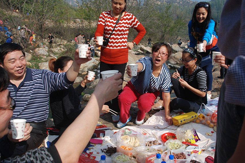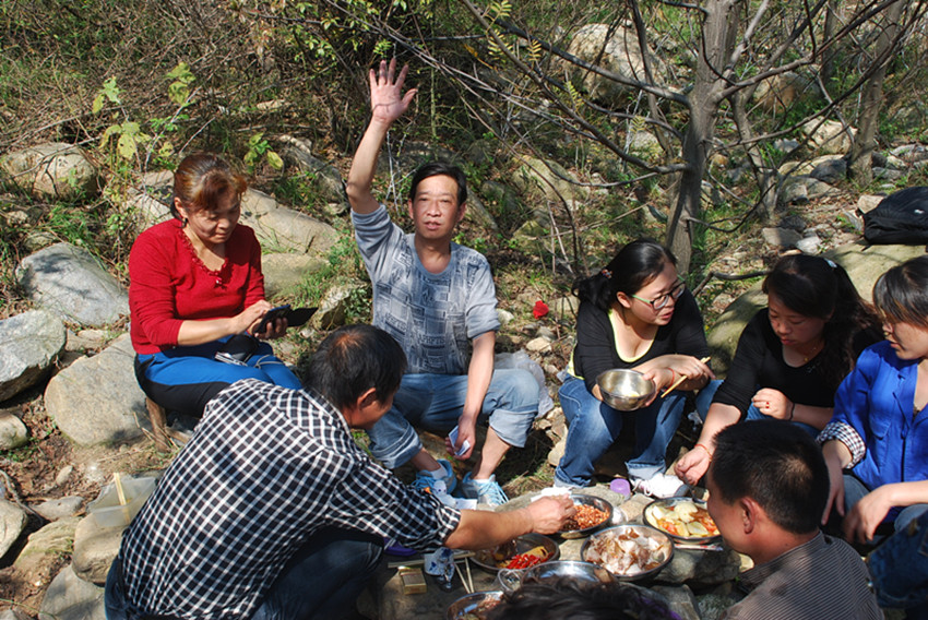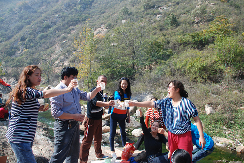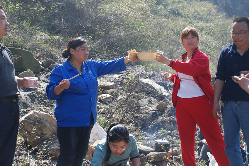 在自由活動時間,有的人挽起褲腳跳入水中,歡快地到處捉泥鰍、逮螃蟹,有的拾柴埋鍋做飯,有的拍照合影留念,有的放線垂釣,有的打牌娛樂休閑,有的高歌一曲現(xiàn)場助興。公司工會副主席王友志、女工主任丁玲先后到上下游各片區(qū)看望大家,并再三叮囑注意環(huán)境衛(wèi)生。之后大家吃著自己制作的豐盛午餐舉杯共飲,這正是秋游健走逛美景,其樂融融賞心悅。