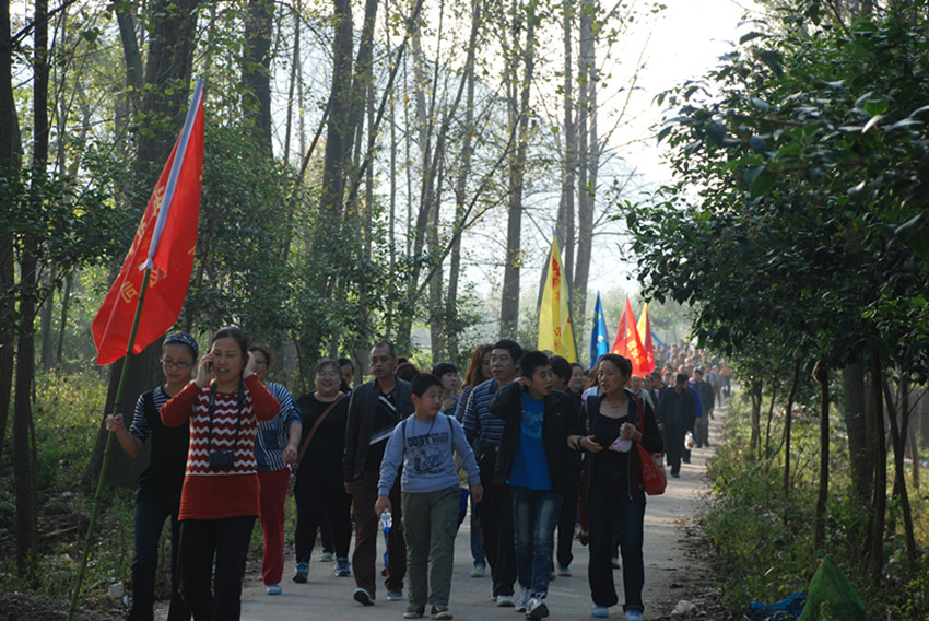 當天晴空萬里,艷陽高照,是戶外活動的好天氣。出發(fā)之前,工會副主席王友志跟大家交代了注意事項,隊伍就浩浩蕩蕩出發(fā)了。一路微風吹拂,彩旗飄楊。“我運動我快樂”的旗幟在陽光照射下顯得格外醒目。隊伍象一條長龍盤繞在鄉(xiāng)間小道上,很是壯觀,為路人增添了一道亮麗的風景線。一路上許許多多的自然景象讓大家看的眼花繚亂,目不暇接。大家邊走邊欣賞,邊走邊聊,留下了一路的歡聲笑語。經(jīng)過1個多小時的步行,九點多鐘大隊人馬陸續(xù)到達目的地,各單位拿著準備好的食物、炊具到溝底河灘找位置安營扎寨。